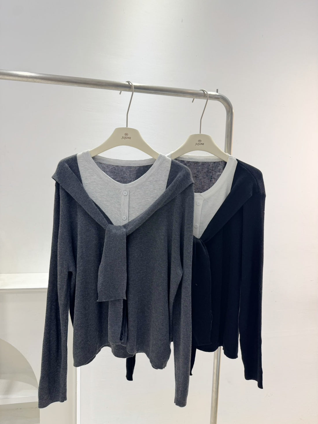 假兩件拼接綁帶針織衫