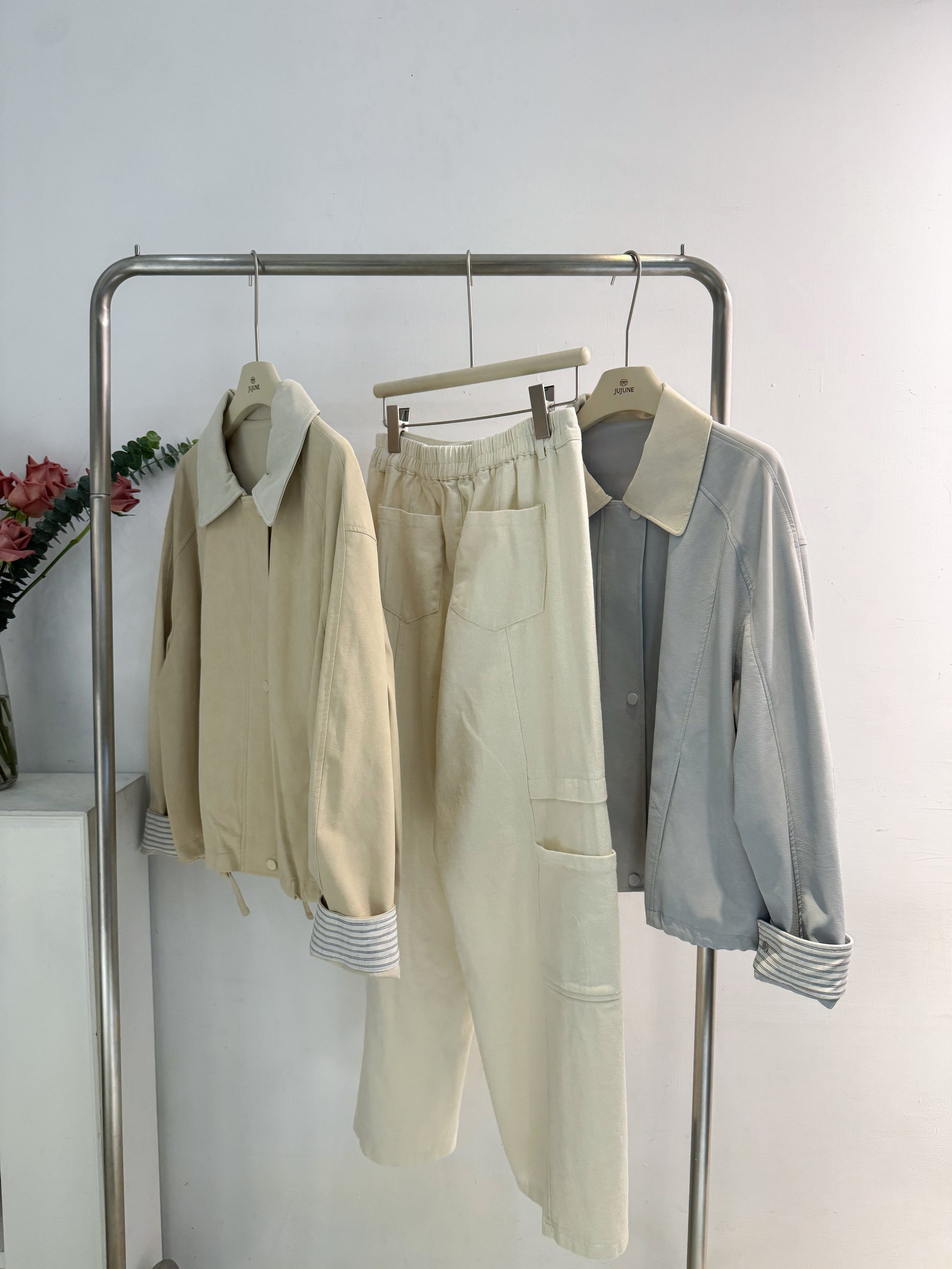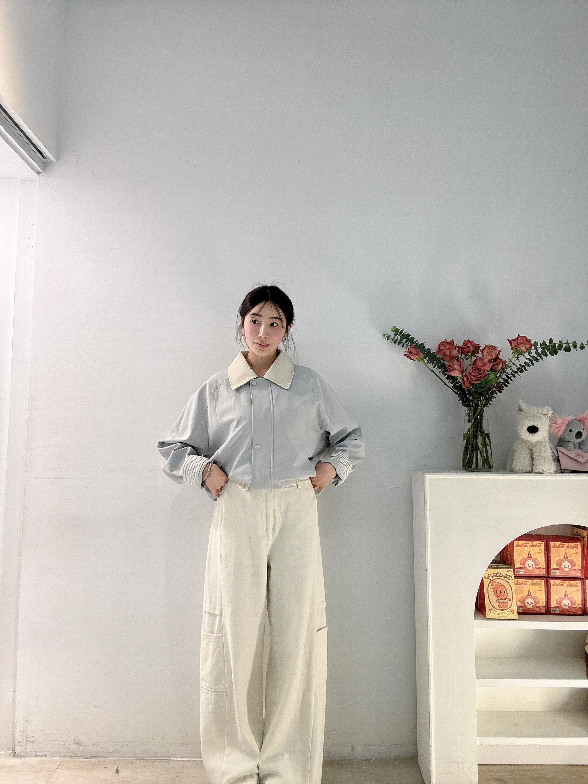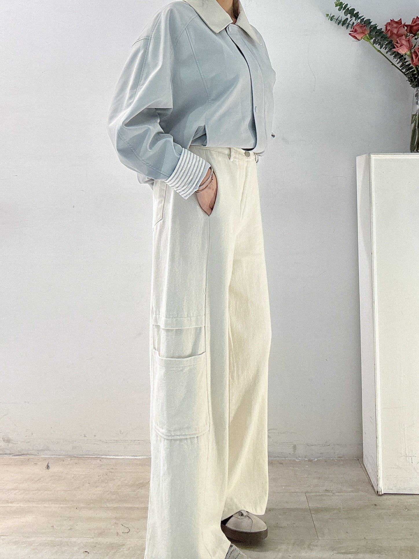 奶油白口袋直筒褲