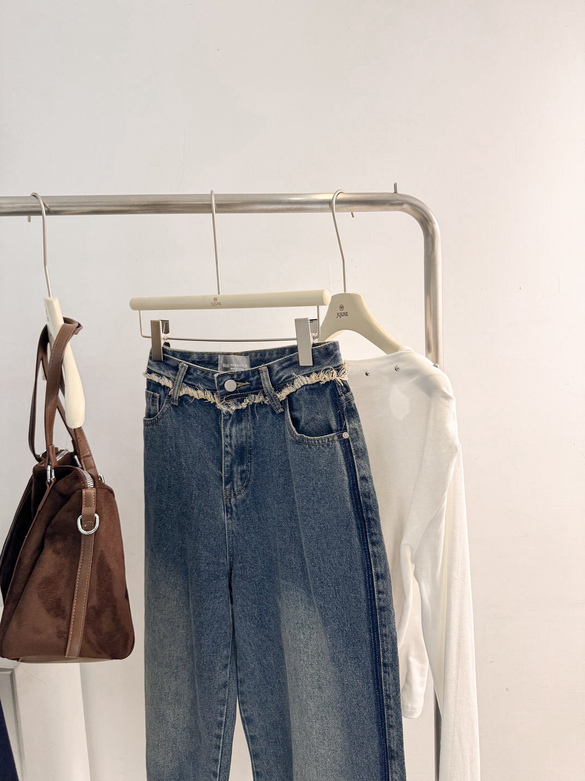 流蘇褲頭直筒褲
