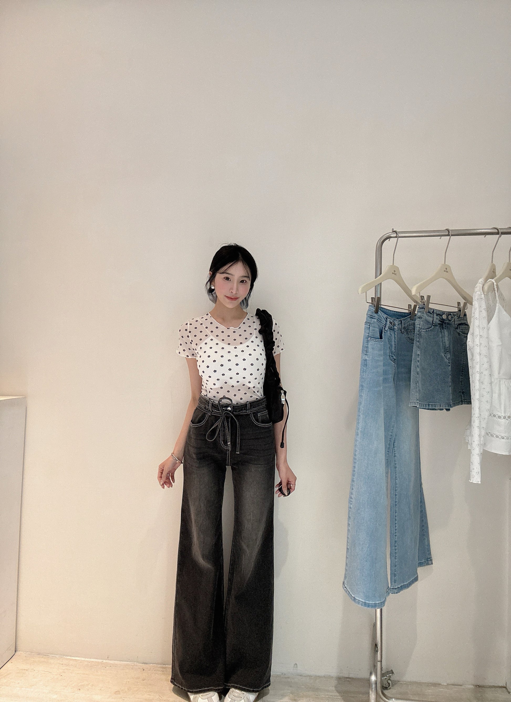 黑白小花透膚衫